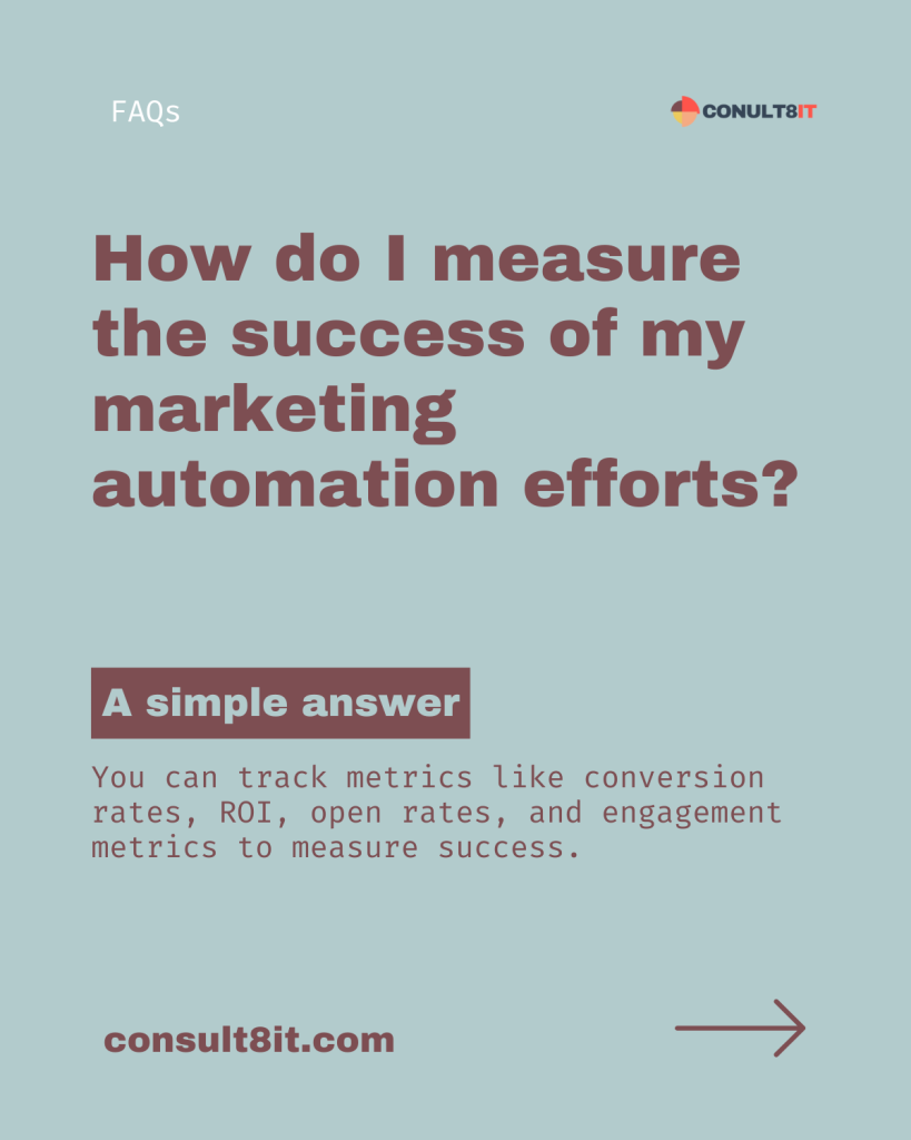Measuring the success of your marketing automation efforts involves tracking key performance indicators (KPIs) that align with your goals. Some important metrics to consider include: